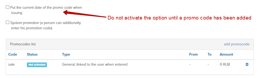 Important! It is used only with promo codes such as “General, linked to the user when entered”. After activating this option in a promotion event, it is not recommended to create new promo codes. If you need to add another promo code, you must first disable the option, save the changes, and only then add a new promo code, save the changes and reactivate the option.