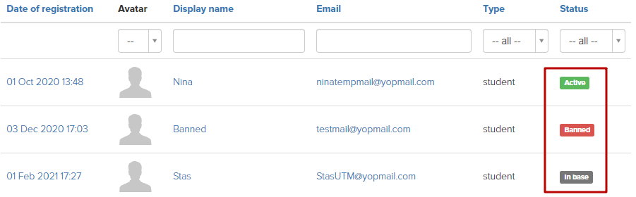 Users with “Banned” status are those who were blocked by you. They can’t sign in to the account (when they try to do it, the system shows a message, that their password is incorrect).