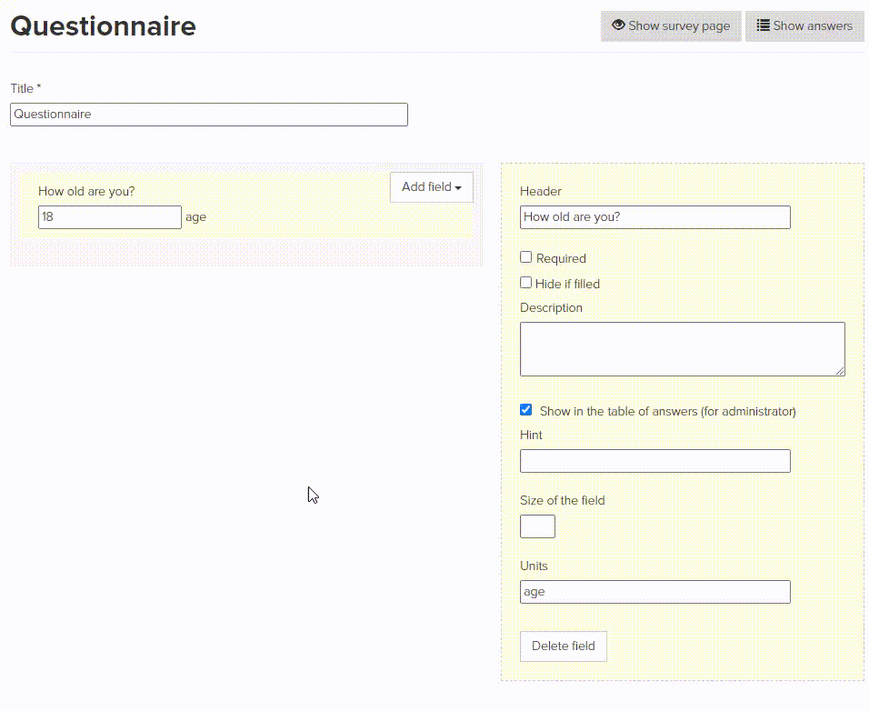 Each of fields can be required (it is marked by a red star). You also can create a comment to a question (a description) and to give hints to users that appear when they are filling in fields.